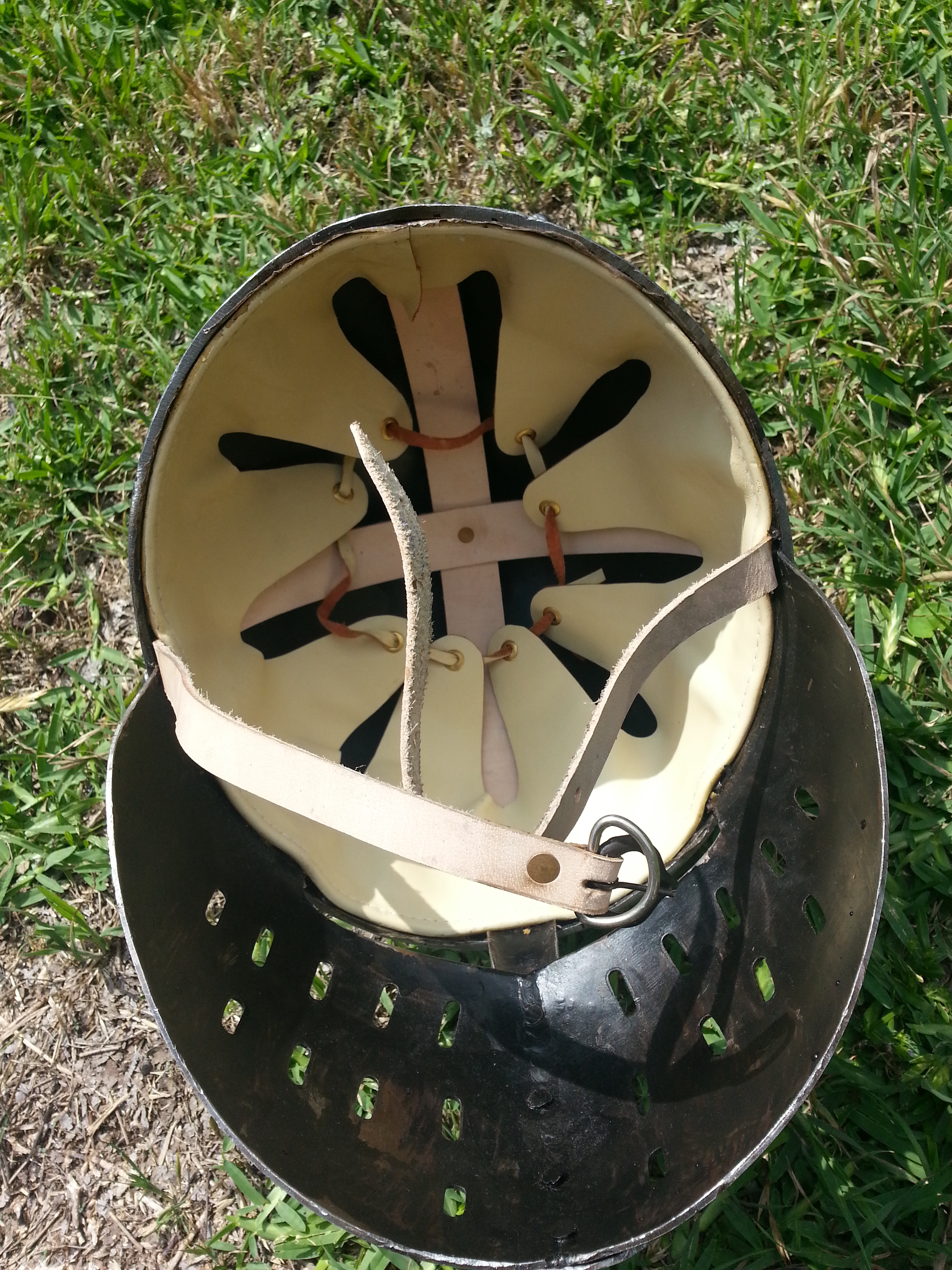 I’ve recently decided to try out this helmet as a replacement for my great helm that I have been wearing for around eight years, and I’ve decided to write a review on the helmet after having some freestyle matches utilizing it. Firstly, the helmet is comfortable to wear and mounts very well on the head. There is room for an arming cap and coif, and you will need that for this helmet. The helmet have wonderful visibility and the breathability inside of this helmet is also great. That said, the oculars on the helmet’s face mask (it is not a hinged visor helm) are larger enough that I highly recommend wearing protective eye hardware inside of the helmet. I use hard plastic eye protection made for doing yard/garden work (mowing and edging). It is not a guarantee against injury, but an added element to help keep the wearer safer in sparring with rebated swords, etc…