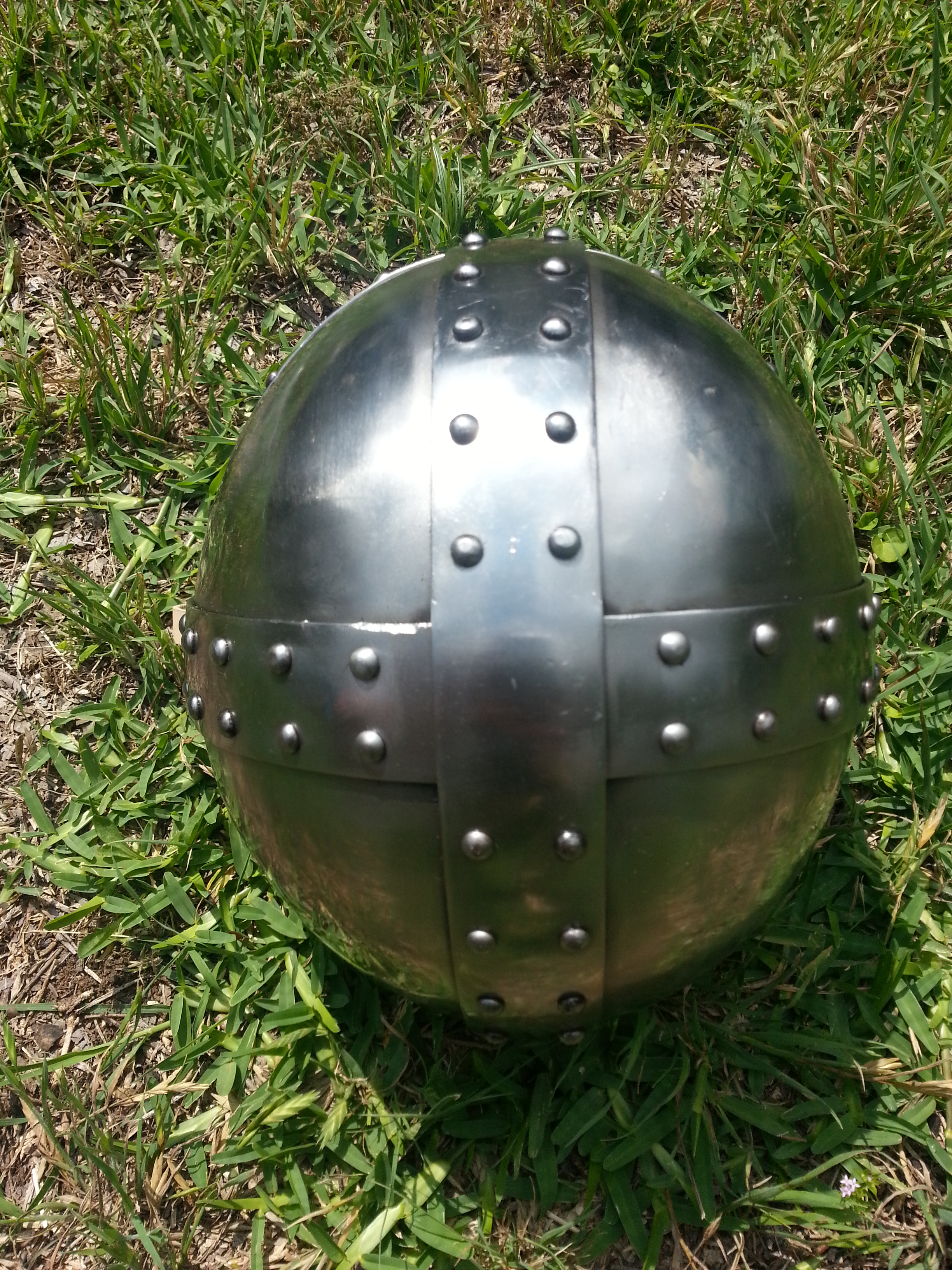 The helmet is also made of 14 gage steel, which is plenty strong enough for contact in reenactment. In my organization we do not allow head strikes on real people in sparring for safety’s sake, though naturally we do instruct striking the head in a number of different ways. All in all The helmet gives some decent protection and is very well constructed. It is also a very aesthetically appealing helmet in my opinion. All of this said, it does not give the protection to the wearer that a great helm, or hound skull bascinet for instance provides for the wearer. In the end, this a very nice helmet for light freestyle sparring, for heavy sparring and melee combat, I would suggest a helmet that gives more protection to the head. And I might add that this style helmet is an earlier type of period helmet than the great helm or bascinet so to get it is to give up some of the advantages of helmets came after this type of spangen helmet had seen action for a while. For the heavy fighting, melee, and tournaments where period armour are used, I will still use my great helm, but in training and light sparring this crusader spangen helm is a nice helmet to have.
