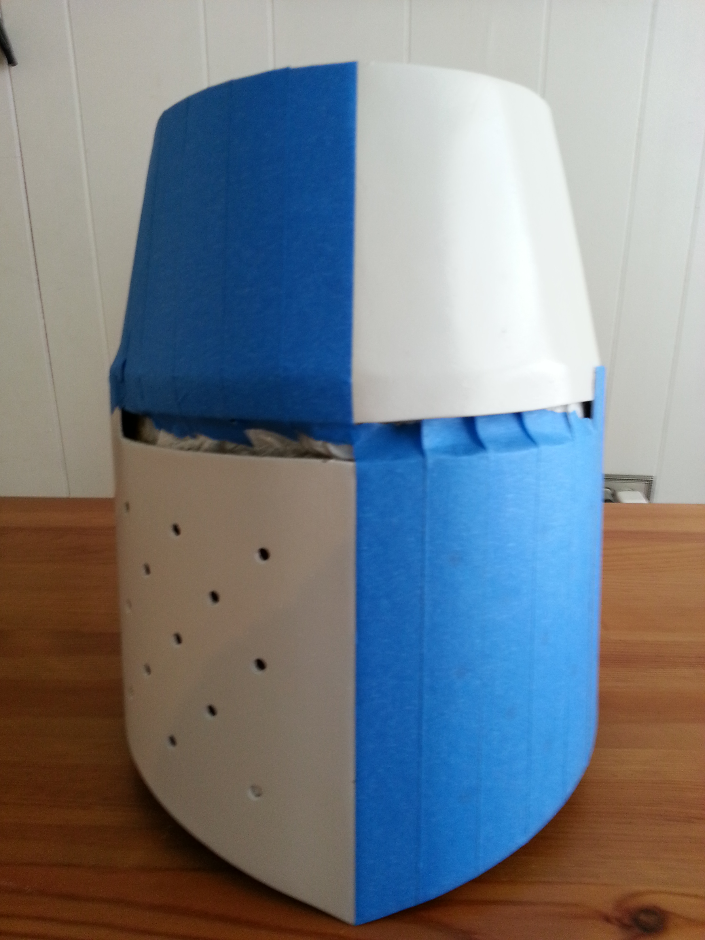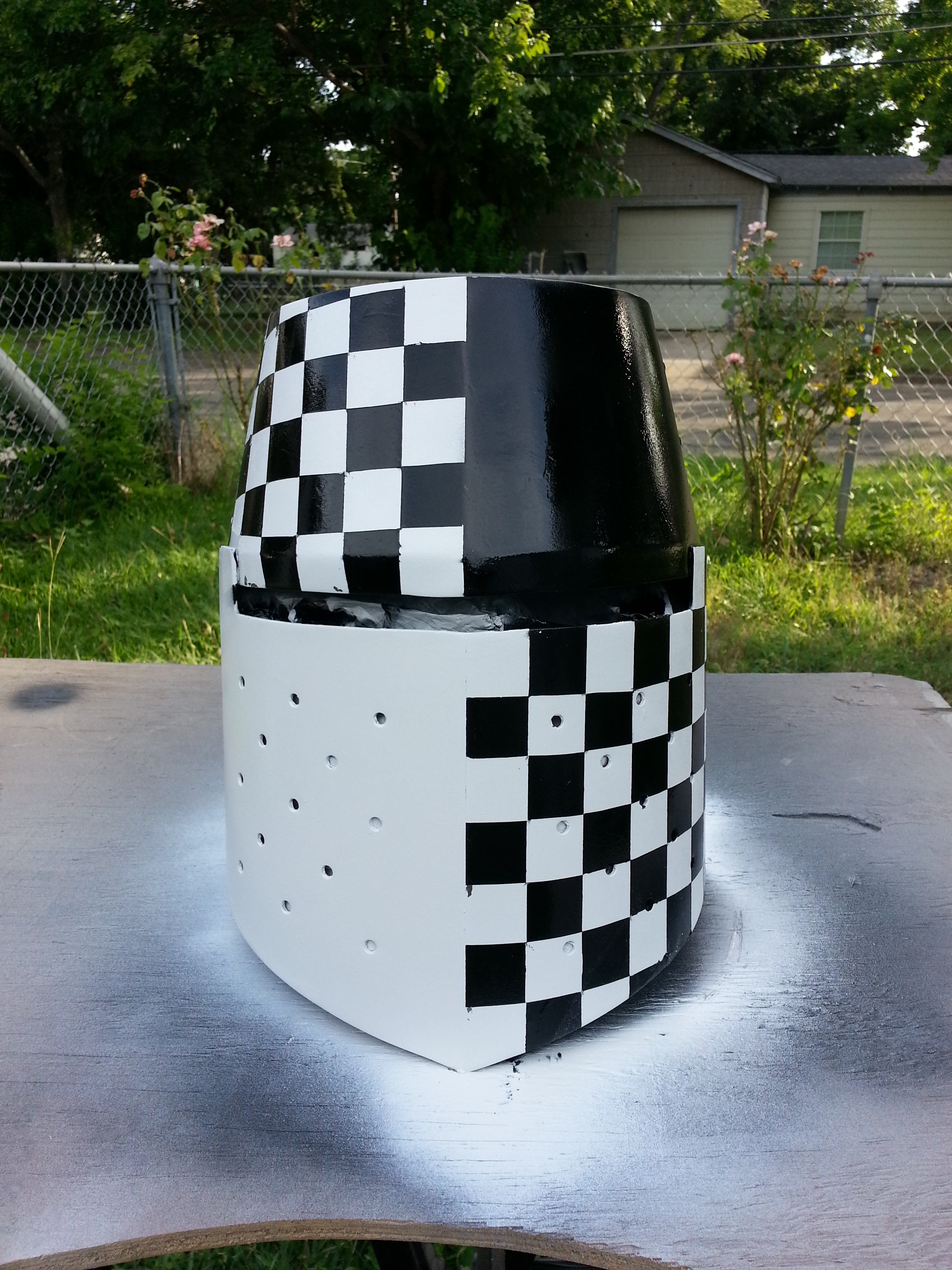 The design I decided go with was the artwork that is on my shield. I thought it would look sharp for my shield, surcoat and helmet’s paint job to all match. after applying two coats of primer to the entire exterior of the helm, and letting it dry completely, I applied two coats of gloss white paint. Once it dried I took the helm inside and began the task of taping the face to begin creating the checkerboard pattern that I wanted. I taped the areas I wanted th design to be on. Since the tape was one inch wide, I measure off one inch squares on the tape after applying it on the helm. I then used my box cutter to carefully slice the tape without harming the white paint under it. Then I removed some of the squares alternately to create the desired checkerboard pattern. This took some time and was the most tedious part of the project. Once I had the checkerboard ready I taped up the remaining areas of the helmet that I did not want painted black in the next phase of painting. I used the painter’s tape again along with some simple notebook paper to cover the areas as seen in the third picture.