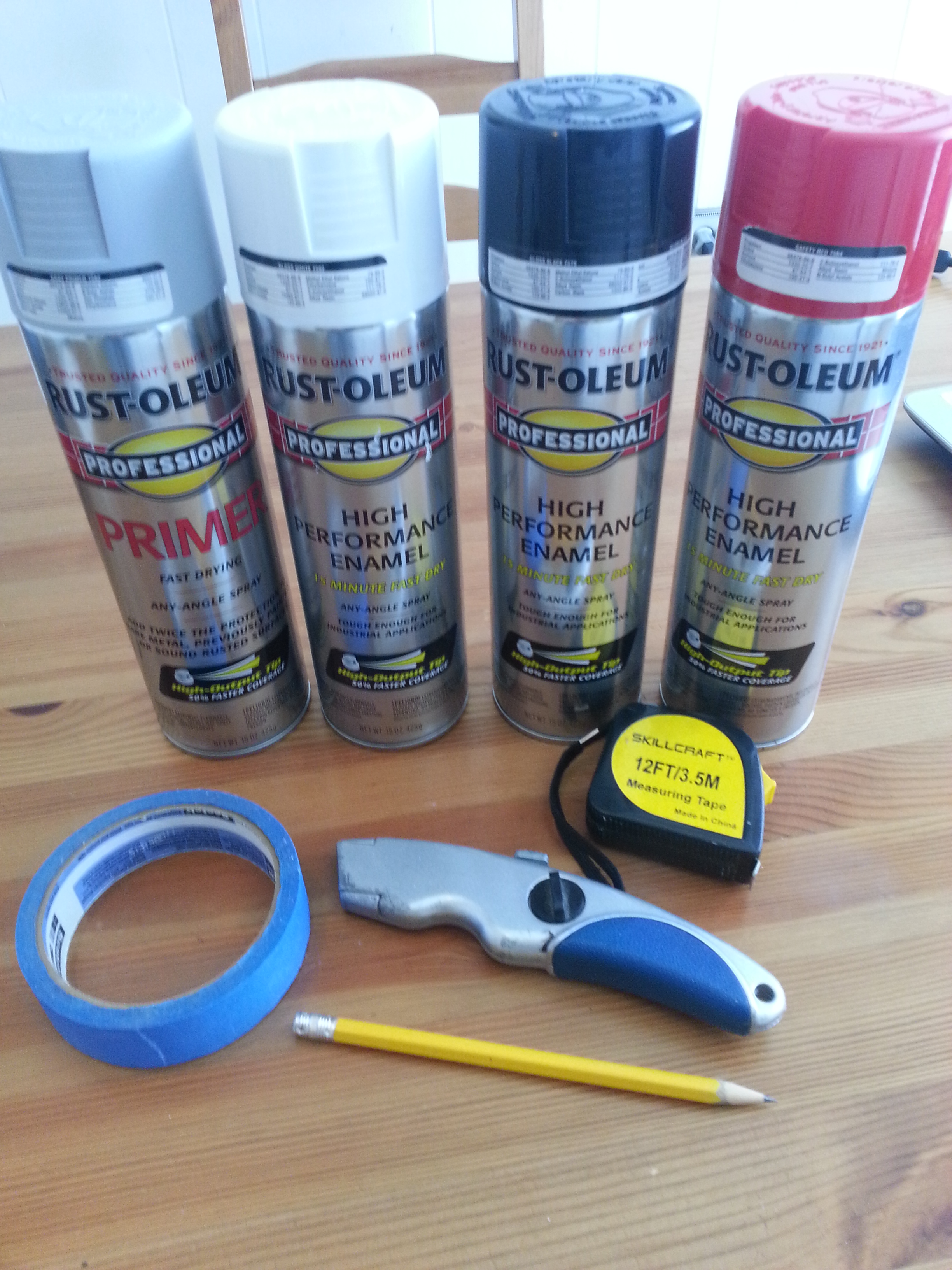 The first thing I did was remove most of the padding from the inside of the helmet, but understand this is probably not a step that you will need to take. I also used paper and tape to close up the eye slot/ocular and the air holes on the face from the inside of the helmet to keep paint from spraying through. The next thing I did was make sure that the exterior was clean of any dust, dirt, etc… Once that was done I took the helmet outside (the weather was very good for painting outside and you want to paint in a well-ventilated area). I purchased some Rust-Oleum Professional High Performance Enamel spray cans for the project. One can of primer and each color desired was more than enough. The can states that the primer and paint dries in 15 minutes, but I’d give it twice that amount of time to dry. Other supplies were a pencil, painter’s tape, a box cutter, and a tape measure.