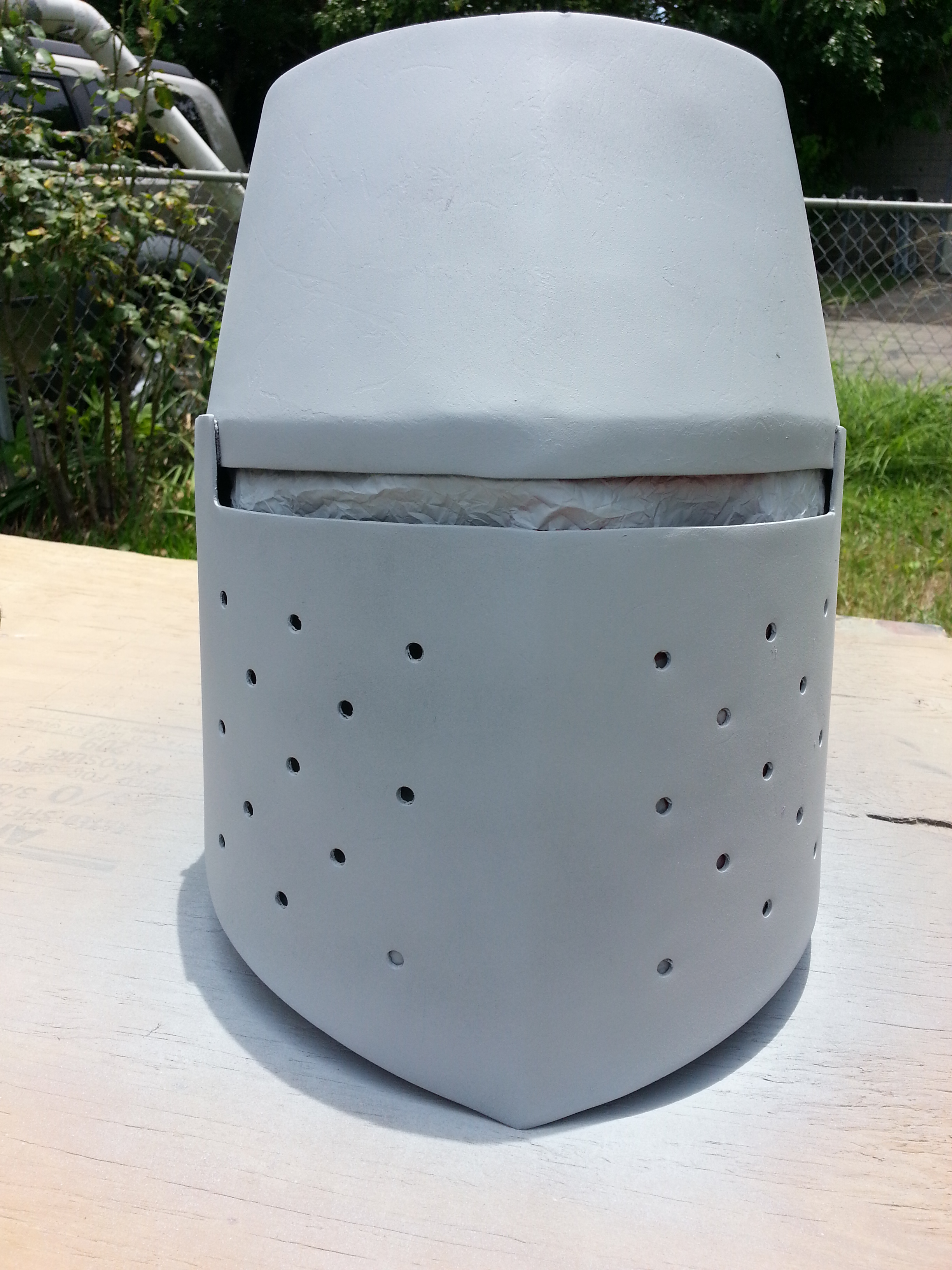 Although my great helm served me faithfully for the better part of a decade, I was starting to look around for another helmet to go along with some upgrades to my harness and gear. As I looked around at the various helmets on the market that are mass-produced, I really did not find anything that I thought would be a good replacement. When I looked at custom helmets from some of the outstanding smiths and forges that exist, the price was just much MUCH more than what I was willing to pay. Some of those custom helms are worth it, but I did not want to, nor could I afford to foot that sort of bill. Part of my issue with my great helm I think came from the human desire to change things up sometimes (like redecorating the house, getting a new house or car…). But my research into a new helm also comes from a knowledge that the great helm (in particular this style) was an earlier helmet and as far as we can tell, did not see much use with a harness of plate armour like the bascinet helmets, sallets, and such did. So, the idea that it would be out of place with my harness was lingering there. That said, as a good friend of mine stated in a conversation recently, “The people depicted in most of the sources in harnesses were royalty or nobility, and were able to afford the most up-to-date and complete harnesses. Others such a lower knights and men-at-arms often had to piece together harnesses and this was not so well depicted.” Something that makes perfect sense, and that I already had lingering in the back of my mind as well. Given this conversation and that fact that my great helm has saved my head and face some pain several times over the span of its service to me, I decided to give it an exterior makeover and continue on with this helm. Since it is historically documented that helms were painted from time to time, why not? I decided to share the basic steps with you.